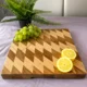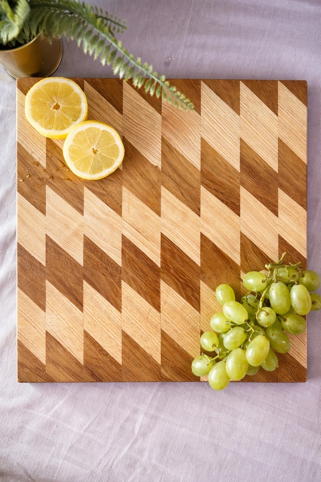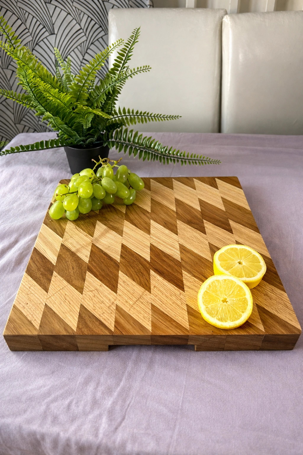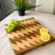 Ta wyjątkowa deska do krojenia to mistrzowskie połączenie funkcjonalności i nowoczesnego designu. Przyciąga uwagę niezwykłym, geometrycznym wzorem z rombów, który powstaje dzięki kontrastowemu zestawieniu jasnego jesionu z głęboką, ciepłą barwą egzotycznego drewna sapele. W przeciwieństwie do modeli sztorcowych, ta deska posiada klasyczny układ włókien (prosty), jednak dzięki precyzyjnemu łączeniu elementów tworzy niesamowity efekt wizualny, który ożywi każdą kuchnię. Jej imponująca grubość (40 mm) zapewnia doskonałą stabilność podczas kulinarnych wyzwań. Jest to produkt w pełni uniwersalny – bez problemu poradzi sobie z krojeniem mięsa, a jej zachwycający wygląd sprawia, że będzie idealną gwiazdą wieczoru jako deska do serwowania serów, owoców czy wędlin.